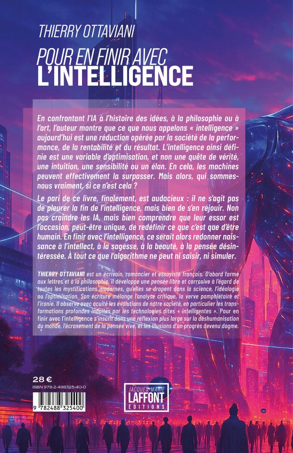Dans Pour en finir avec l’intelligence, Thierry Ottaviani propose un essai décapant sur l’avènement de l’intelligence artificielle et la façon dont elle redéfinit nos repères les plus fondamentaux. Loin des discours enthousiastes qui célèbrent sans nuance les prouesses technologiques, l’auteur invite à un recul critique sur la notion même d’« intelligence ». En réalité, affirme-t-il, ce que l’IA est en train de remplacer n’est pas notre humanité, mais une certaine idée réductrice, mécanique et productiviste de l’intelligence, une idée que nous avons acceptée trop vite comme la nôtre.